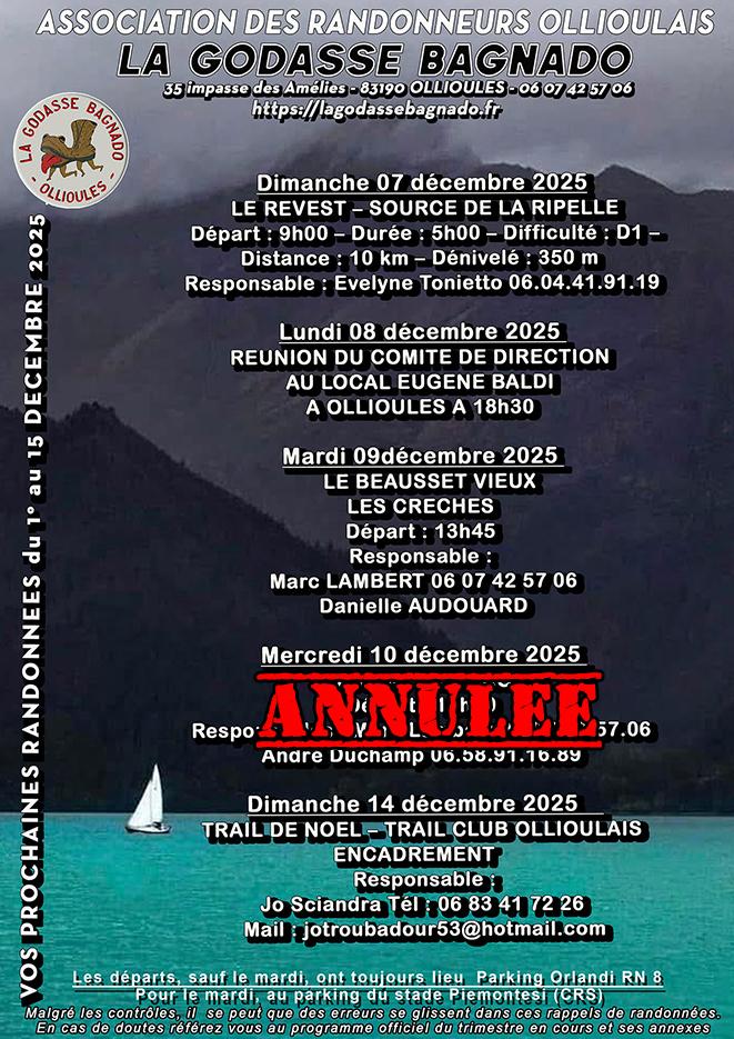 LA GODASSE BAGNADO Décembre 2025 (MAJ 15/12/2025) Prochains rendez-vous (MAJ 06/12/2025) Programme et Godasse Bavarde (MAJ 10/12/2025) Dernières Galeries Photos (MAJ 15/12/2025) Vidéos de La Godasse Bagnado (MAJ 18/08/2025) Communication (MAJ 10/08/2025) ASSOCIATION DES RANDONNEURS OLLIOULAIS :LA GODASSE BAGNADO – 35 impasse des améliés 83190 OLLIOULES Contact Président Contact Webmaster