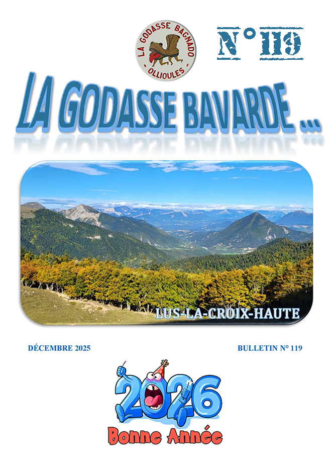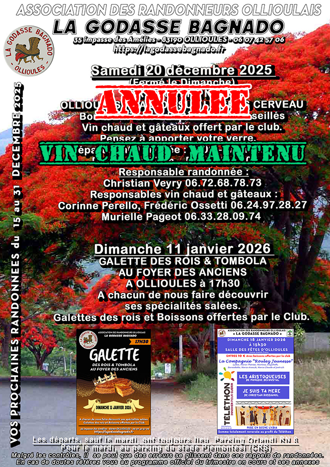 LA GODASSE BAGNADO Décembre 2025 (MAJ 24/12/2025) Prochains rendez-vous (MAJ 19/12/2025) Programme et Godasse Bavarde (MAJ 20/12/2025) Dernières Galeries Photos (MAJ 15/12/2025) Vidéos de La Godasse Bagnado (MAJ 18/08/2025) Communication (MAJ 10/08/2025) ASSOCIATION DES RANDONNEURS OLLIOULAIS :LA GODASSE BAGNADO – 35 impasse des améliés 83190 OLLIOULES Contact Président Contact Webmaster